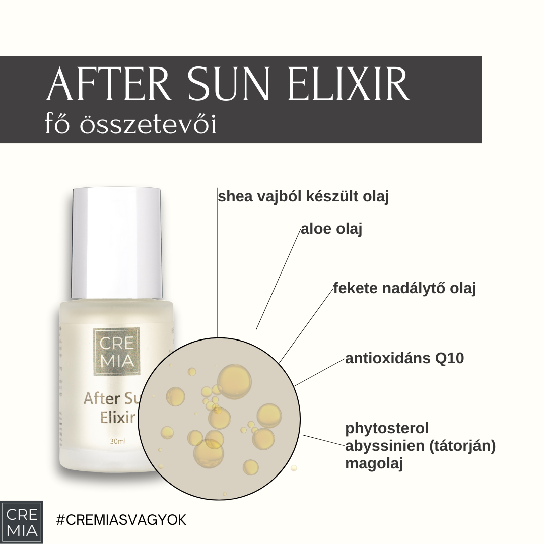 Napozás utáni bőrnyugtató, bársonyos bőrérzetet nyújtó olajszérum. Bőrnyugtató hatása a shea vajból készült olajnak, az aloe olajnak, a fekete nadálytő olajnak és az antioxidáns Q10-nek köszönhető. A Phytosterol Abyssinien (tátorján) magolaj fitoszterolokkal képzett észtere finom bevonatot képez a bőr felszínén, elősegítve a bőr hidratálását. A fitoszterolok bőrkondícionáló tulajdonságukról ismertek.