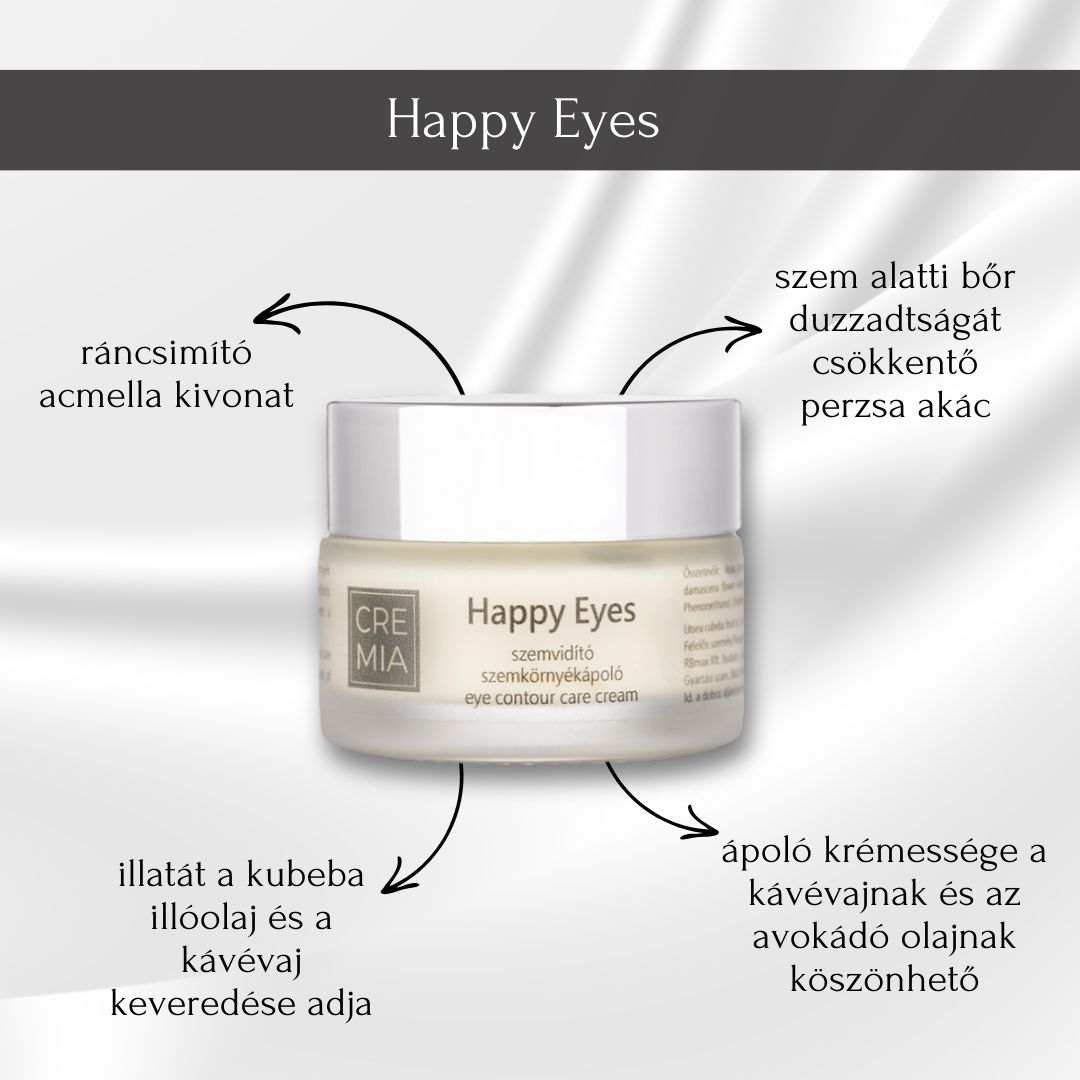 A Happy Eyes szemvidító szemkörnyékápoló krémet a szemkörnyéki vékony bőr mindennapi ápolására ajánljuk.