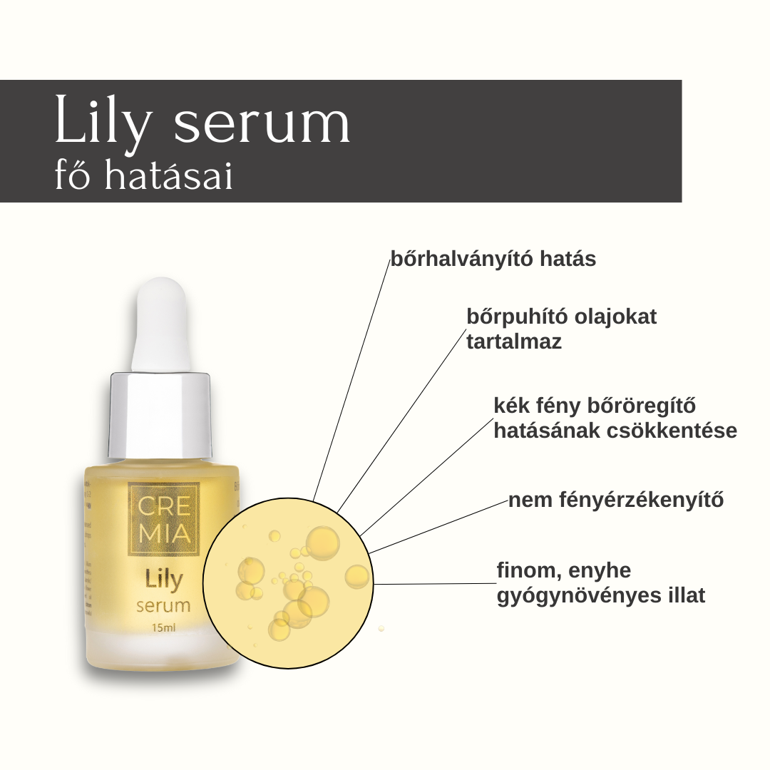Készítettünk egy bőrhalványító és bőrpuhító olajokat tartalmazó koncentrátumot, amit a fehér lilom olaj  tartalma miatt neveztünk Lily serumnak. Természetes összetevői, mint a ligetszépe olaj, az E-vitamin,  répamag olaj gyengéden ápolják és nyugtatják bőrödet, a fehérliliom olaj hosszú távon fejti ki bőrhalványító hatását.