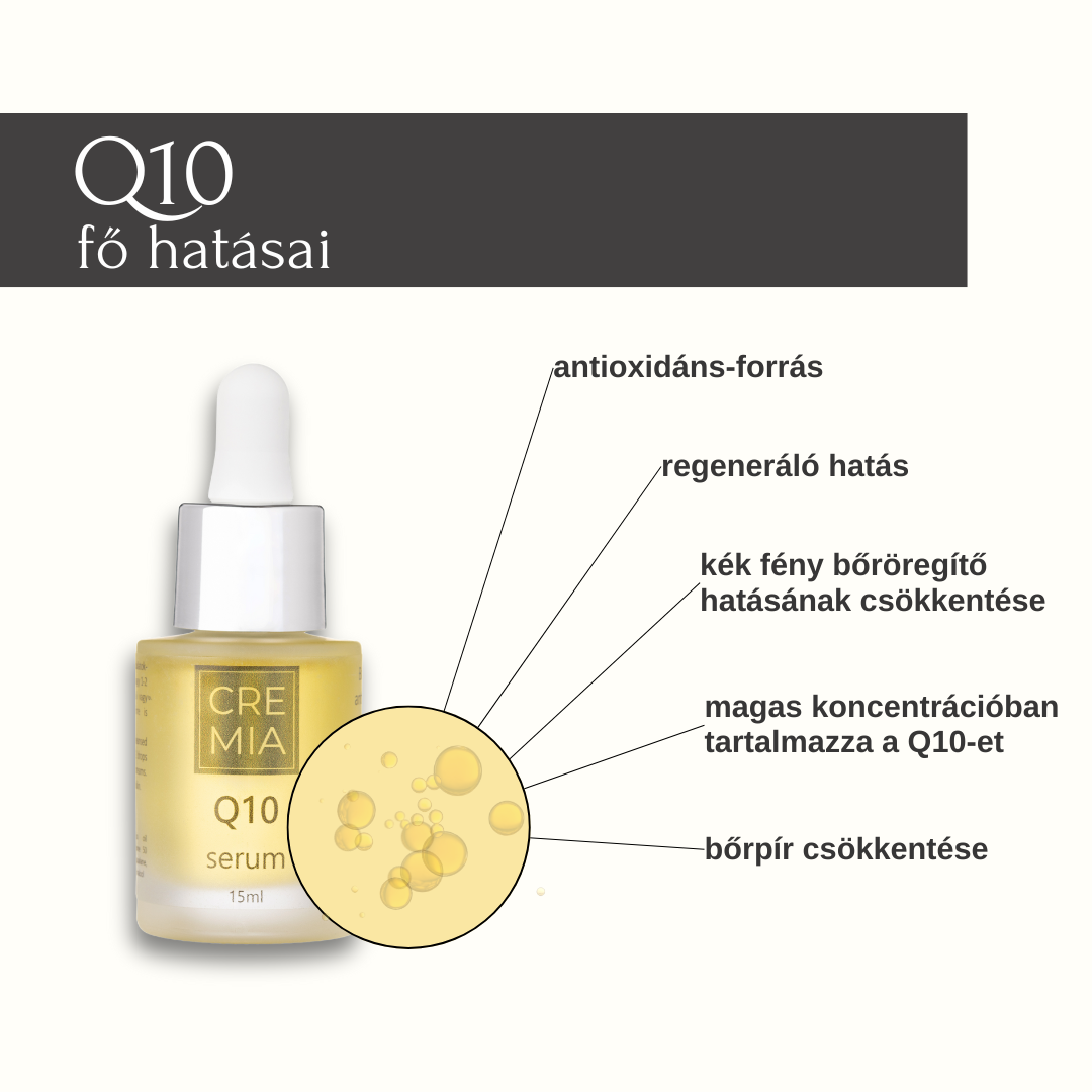 A Q10 egy kiváló regeneráló, antioxidáns hatású komplex összetevő, amit ez a szérum magas koncentrációban tartalmaz. Lehet önállóan is használni, de érdemes pár cseppet belekeverni a szokásos arc- vagy kézkrémekbe, például a Happy Face, a Night Repair és a Happy Hands krémekbe.
