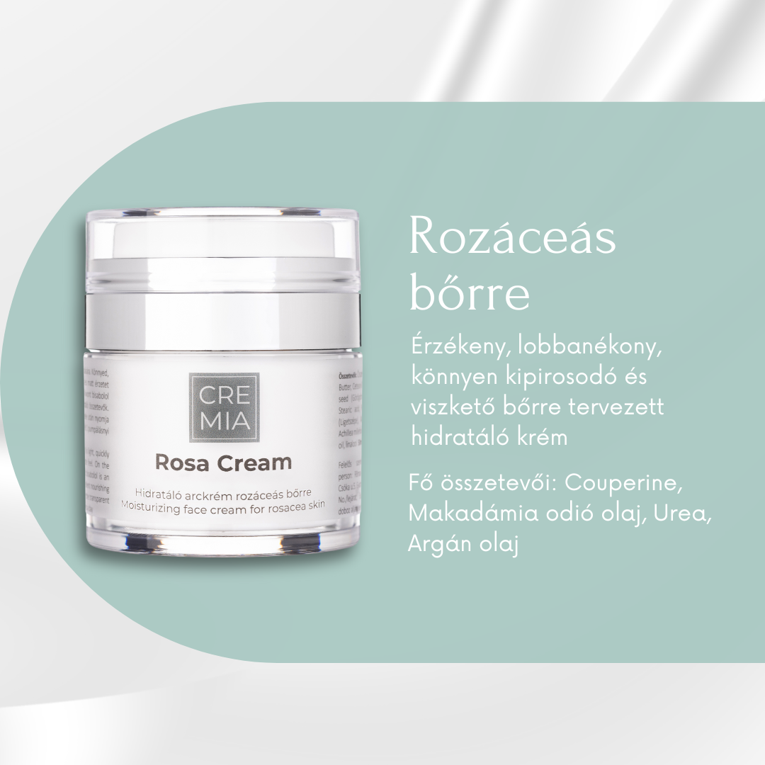 A rosaceás bőr érzékeny, lobbanékony, könnyen kipirosodik és viszket – óvatos kezelést igényel. A Rosa Cream egy nagyon enyhe illatú, könnyed hidratáló krém, fő összetevője a Couperine, ami a fügekaktusz virágának és a rukkolának egy speciális kivonata. A Couperine olasz kutatók által szabadalmaztatott kivonási eljárással készül. Belekomponáltuk a rendkívül jól hidratáló ureát is, ami bőrazonos alkotóelem. Finom, púderes illatát a benne lévő értékes olajaknak köszönheti.